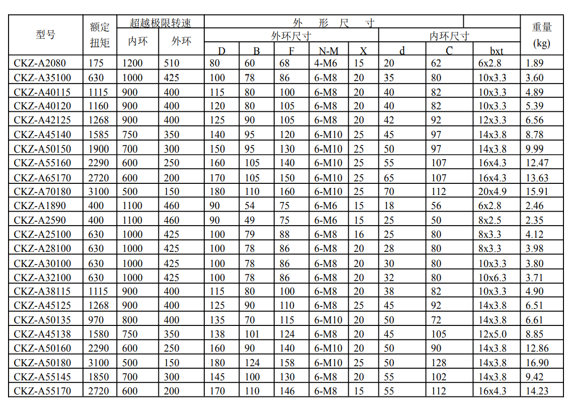 特性及應(yīng)用:CKZ-A 系列為楔塊式單向離合器,內(nèi)含兩套深溝球軸承支撐及油封。依照不同需要,出廠時(shí)內(nèi)含 潤滑油或潤滑脂。 內(nèi)環(huán)用與軸用鍵聯(lián)結(jié)外環(huán)為 h7 公差與體壁 H7 公差配合,并用螺栓聯(lián)結(jié)。 用在包裝、運(yùn)輸。冶金、礦山等機(jī)械上。防止逆轉(zhuǎn),或超越運(yùn)轉(zhuǎn),適合中速運(yùn)行。